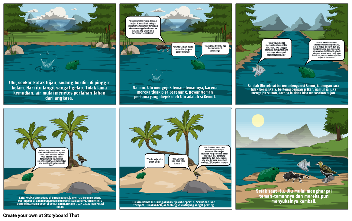 Ulu, seekor katak hijau, sedang berdiri di pinggir kolam. Hari itu langit sangat gelap. Tidak lama kemudian, air mulai menetes perlahan-lahan dari angkasa.