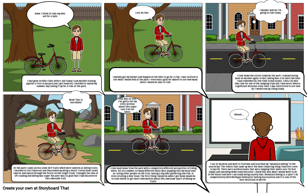 I sat at my desk and went to YouTube and searched up mountain biking in the search bar. The videos that came up were the most inspiring thing I had ever seen in my life. There were professionals that were jumping their bikes over 50 foot jumps and speeding down rocky descents. I knew this was what I would want to do in the future and here I am today doing exactly that. Mountain biking is a sport I do competatively with Michigan Scholastic Cycling Association and it is one of the best decisions of my life.