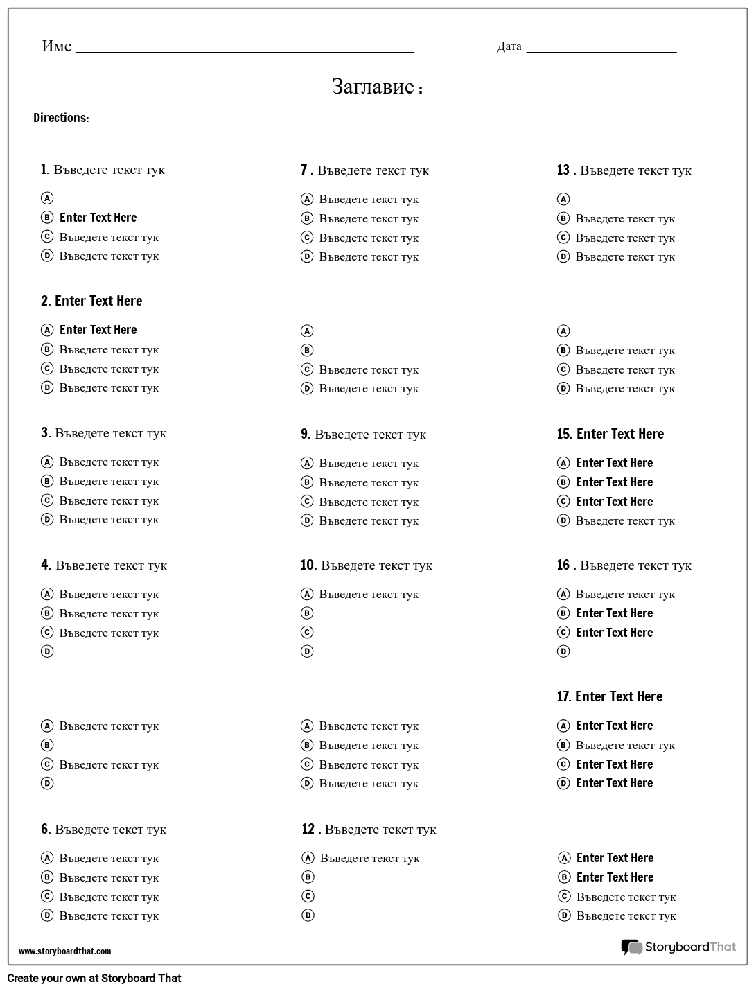 Шаблон за тест с множество избори с 3 колони и 18 въпроса