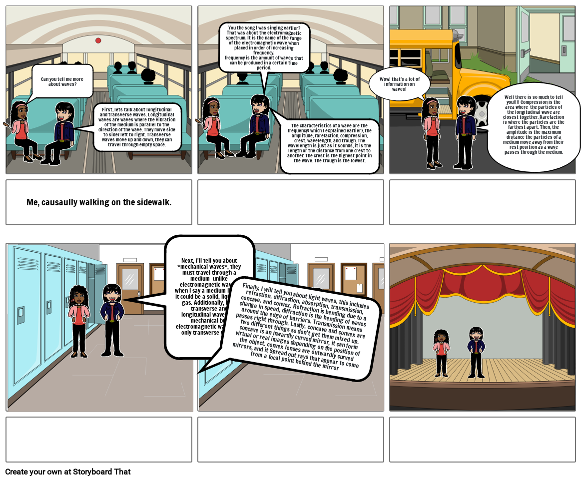 Next, i'll tell you about *mechanical waves*, they must travel through a medium  unlike electromagnetic waves, when I say a medium I mean it could be a solid, liquid, or gas. Additionally, both transverse and longitudinal waves are mechanical but electromagnetic waves are only transverse waves.