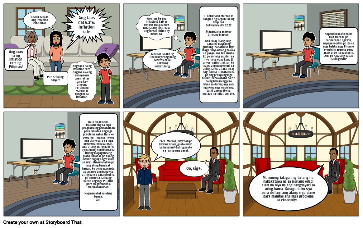 G. Ferdinand Marcos Jr.Pangulo ng Republika ng PilipinasSetyembre 09, 2022Magandang araw po Ginoong Marcos.Ako po ay isang mag-aaral na mayroong gustong ipahatid sa inyo. Itago ninyo nalang po ako sa pangalang Jan. Gusto ko po sanang sabihin sa inyo na sa edad kong 11 anyos, naiinitindihan ko na po ang nangyayari sa ating bansa at ako po ay nag-aalala. Tumataas na po ang presyo ng mga bilihin, napakababa na rin po ng halaga ng piso laban sa dolyar, ang sabi ng aking mga magulang, dahil daw po ito sa mataas na inflation rate.