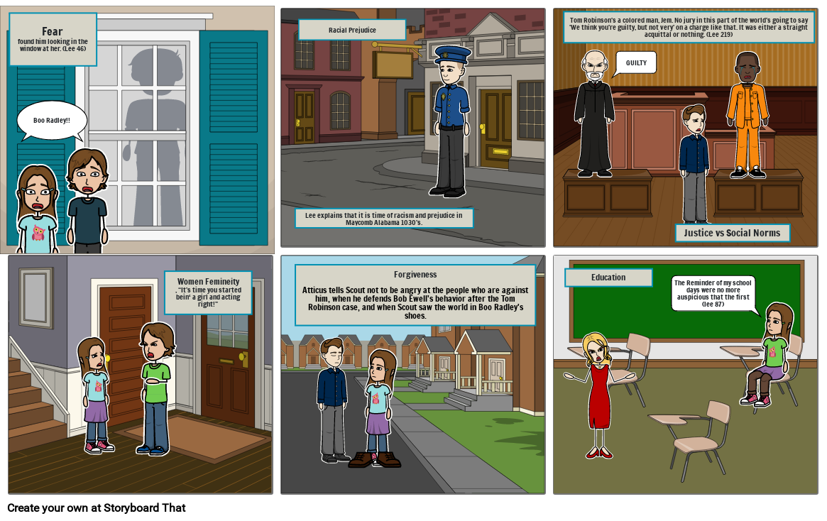 Forgiveness Atticus tells Scout not to be angry at the people who are against him, when he defends Bob Ewell's behavior after the Tom Robinson case, and when Scout saw the world in Boo Radley's shoes.