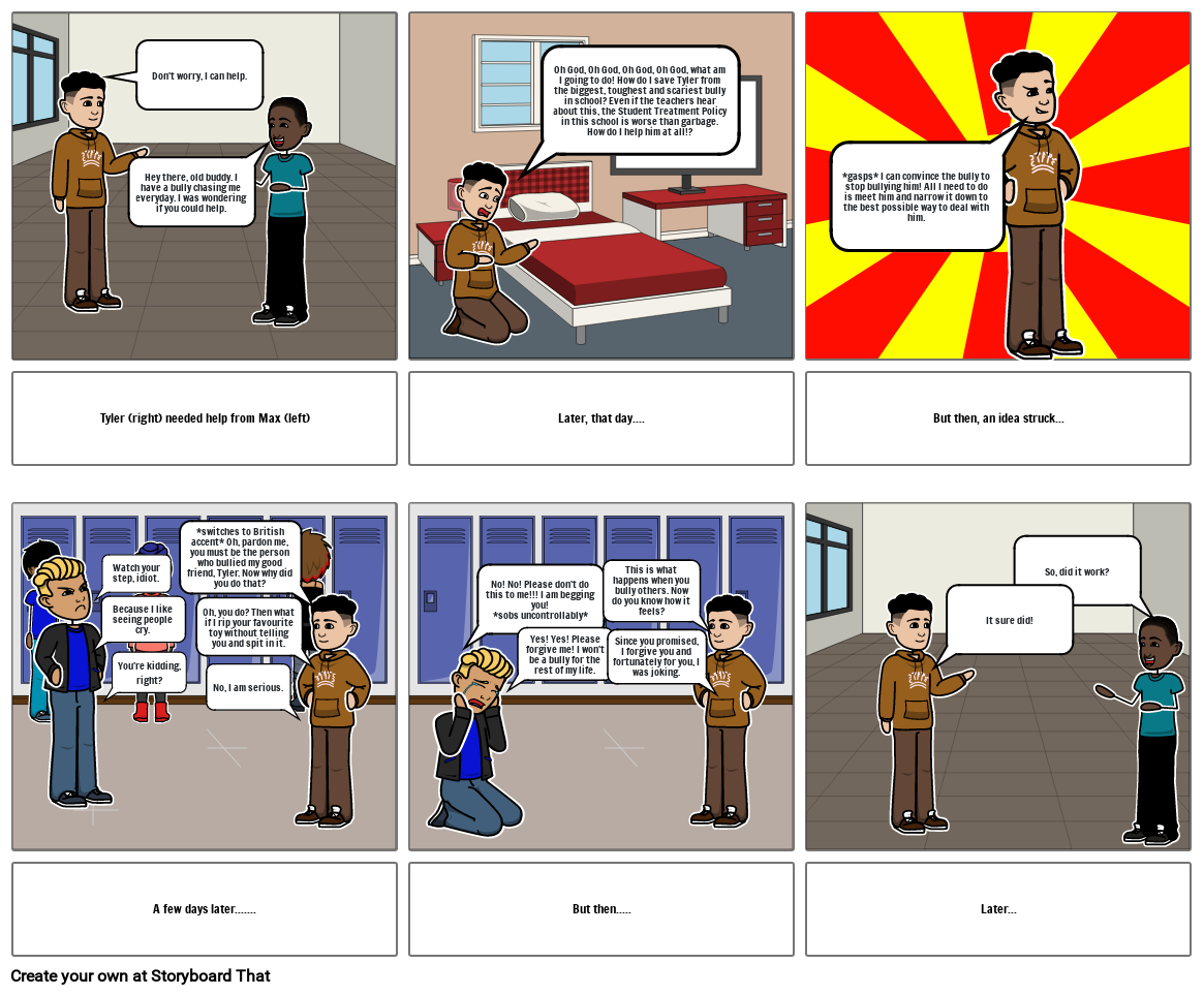 Oh God, Oh God, Oh God, Oh God, what am I going to do! How do I save Tyler from the biggest, toughest and scariest bully in school? Even if the teachers hear about this, the Student Treatment Policy in this school is worse than garbage. How do I help him at all!?