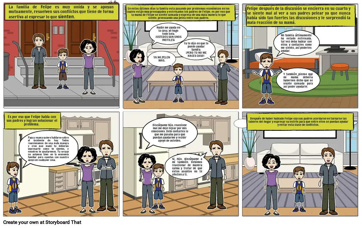 Después de haber hablado Felipe con sus padres acordaron en turnarse las labores del hogar y expresar su estrés para que entre ellos se puedan ayudar y evitar esta clase de conflictos.