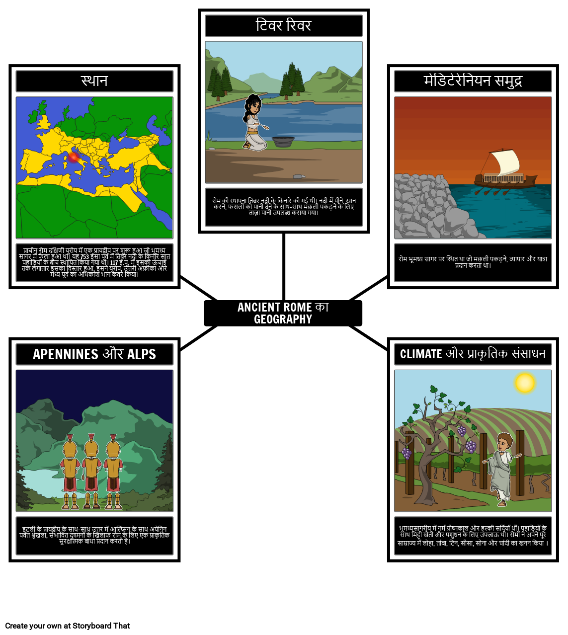 GRAPES: भूगोल, धर्म, उपलब्धियां, राजनीति, अर्थव्यवस्था और सामाजिक जीवन। यह स्टोरीबोर्ड प्राचीन रोम की भौगोलिक विशेषताओं की व्याख्या करता है।
