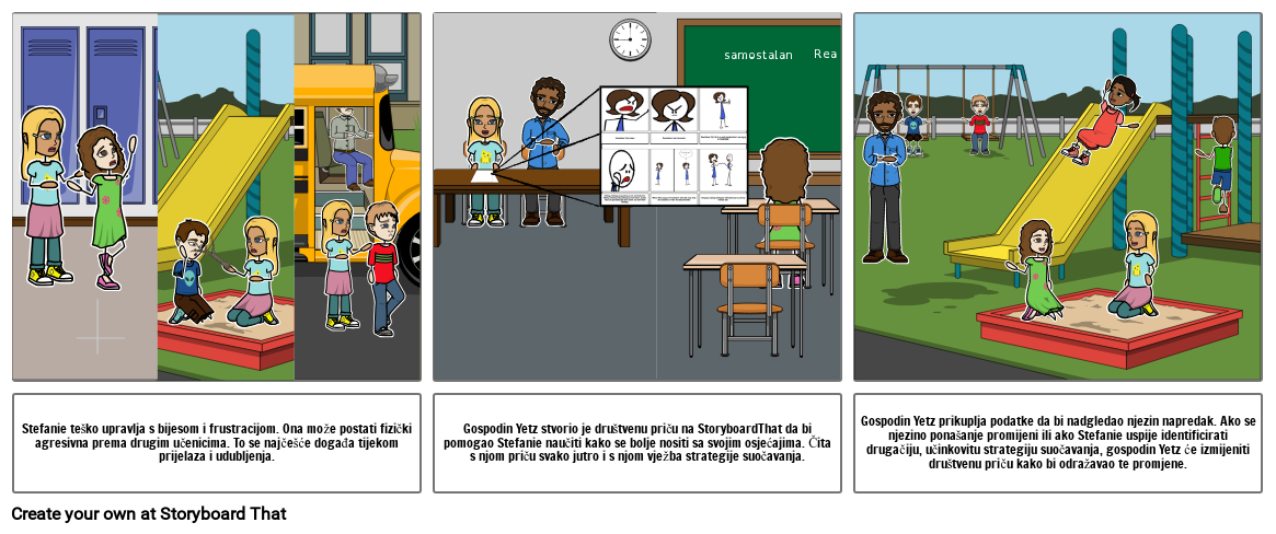 Gospodin Yetz stvorio je društvenu priču na StoryboardThat da bi pomogao Stefanie naučiti kako se bolje nositi sa svojim osjećajima. Čita s njom priču svako jutro i s njom vježba strategije suočavanja.