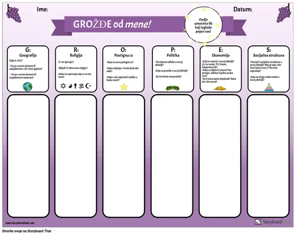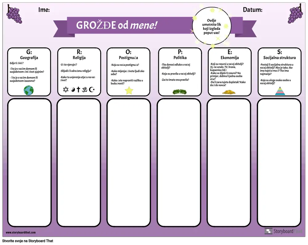Upotrijebite ovaj grafički organizator da svojim studentima predstavite akronim GRAPES. Studenti odgovaraju na pitanja za svaku kategoriju: zemljopis, religija, postignuća, politika, gospodarstvo i društvena struktura, razmišljajući o vlastitom životu i iskustvima. Nakon što imaju priliku razmišljati i pisati, učitelji mogu voditi razrednu raspravu o svakoj kategoriji. Ovo je korisna aktivnost izgradnje zajednice, kao i način da se predstavi ovaj jednostavni grafički organizator koji se može koristiti za proučavanje svake drevne civilizacije.