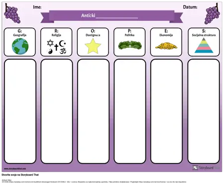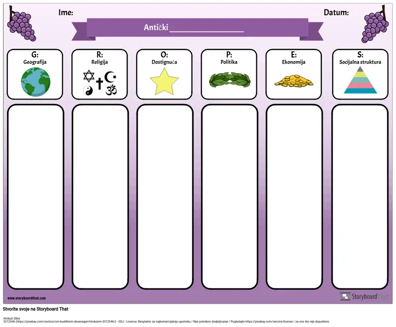 Skraćenica GRAPES koristan je alat pri proučavanju drevnih civilizacija ili različitih zemalja. Upotrijebite ovaj grafikon GRAPES digitalno (neka učenici ukucaju svoje bilješke i dodaju slike u svaku kategoriju) ili ga ispisuju, a učenici mogu rukopisati svoje bilješke.