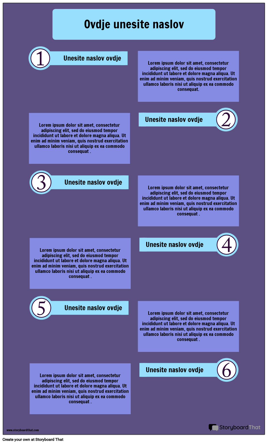 Ova infografika procesa dizajna uključuje dovoljno prostora za tekst, grafiku i više koraka za rastavljanje velikog projekta na dijelove kojima se može upravljati. Plava i ljubičasta shema boja.