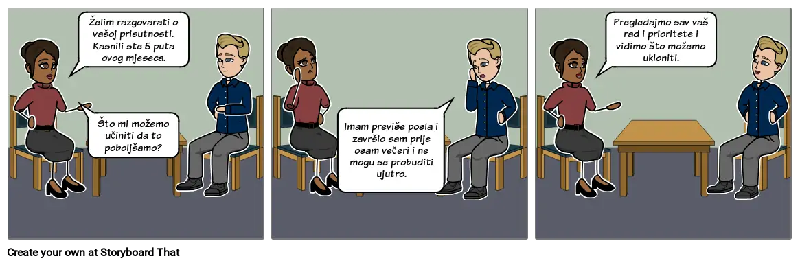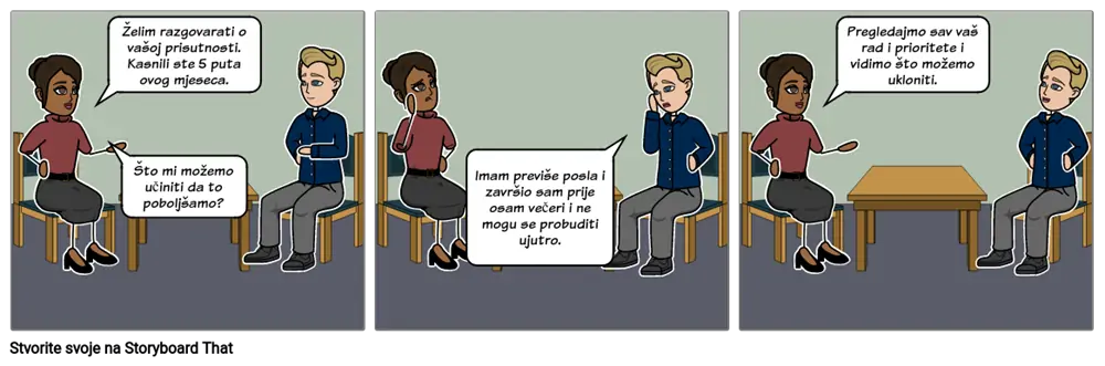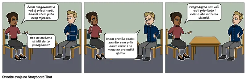 • Želim razgovarati o vašoj prisutnosti. Kasnili ste 5 puta ovog mjeseca.