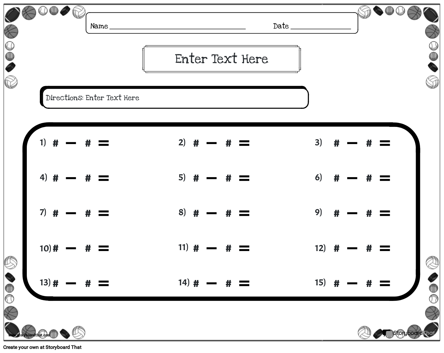 Radni list za vježbu oduzimanja na temu sporta. Crno-bijelo za lakši ispis.
