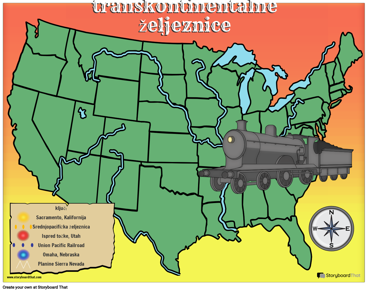 Ovaj predložak karte uključuje simbole u ključu koje studenti mogu kopirati i smjestiti na točno mjesto na karti kako bi pokazali svoje razumijevanje mjesta na kojem su Central Pacific Pacific i Union Pacific Railroad izgradili svoje tračnice od 1863-1869 dovršavajući prvu transkontinentalnu željeznicu.