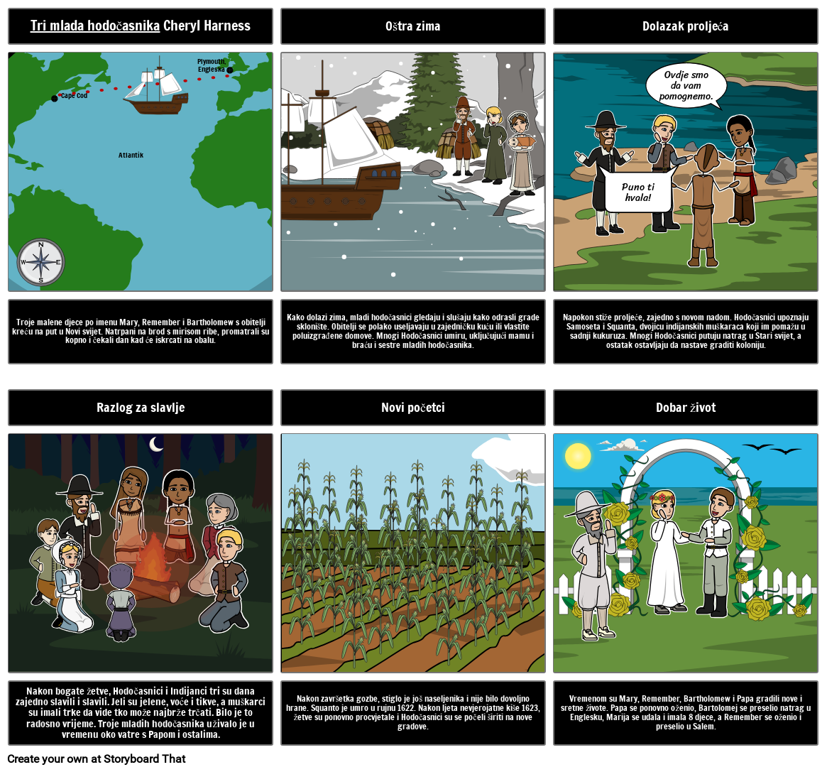 Nakon bogate žetve, Hodočasnici i Indijanci tri su dana zajedno slavili i slavili. Jeli su jelene, voće i tikve, a muškarci su imali trke da vide tko može najbrže trčati. Bilo je to radosno vrijeme. Troje mladih hodočasnika uživalo je u vremenu oko vatre s Papom i ostalima.
