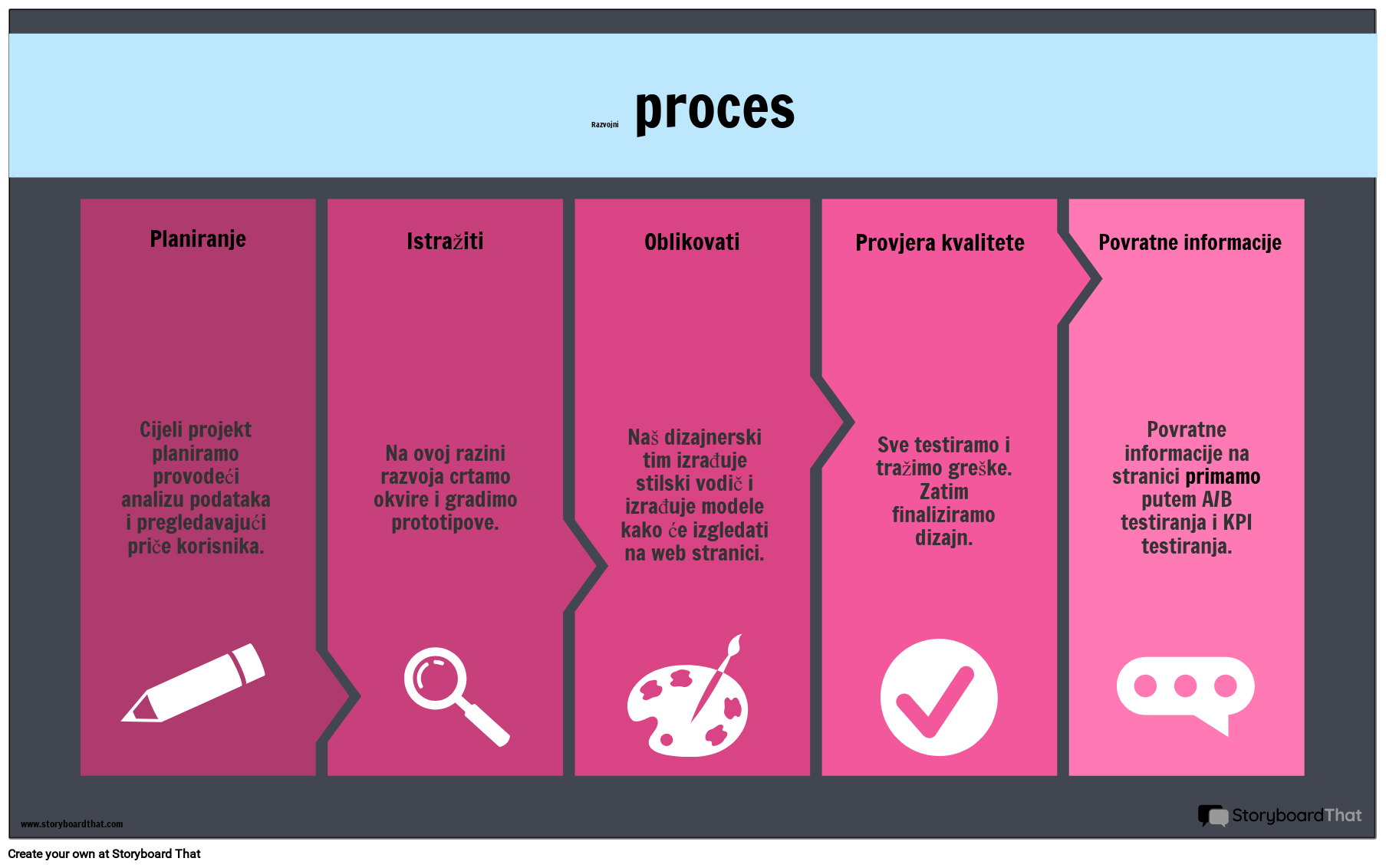 Cijeli projekt planiramo provodeći analizu podataka i pregledavajući priče korisnika. Na ovoj razini razvoja crtamo okvire i gradimo prototipove. Naš dizajnerski tim izrađuje stilski vodič i izrađuje modele kako će izgledati na web stranici. Sve testiramo i tražimo greške. Zatim finaliziramo dizajn. Povratne informacije na stranici primamo putem A/B testiranja i KPI testiranja.