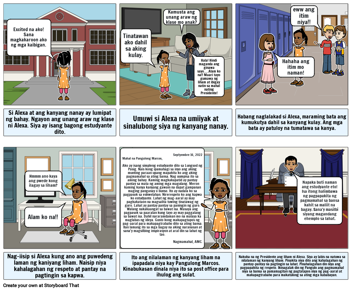 Nakuha na ng Presidente ang liham ni Alexa. Siya ay labis na natuwa sa nilalaman ng kanyang liham. Pinakita niya dito ang kahalagahan ng pantay-pantay na pagtingin sa lahat. Pinahalagahan din niya ang pagpapakita ng respeto. Ikinagalak din ng Pangulo ang pagmamahal niya sa bansa sa pamamagitan ng pagtatapos niya ng pag-aaral at makapagtrabaho para makatulong sa ating mga kababayan.