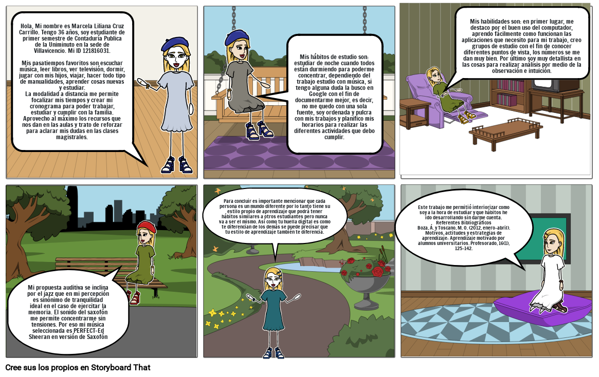 Hola, Mi nombre es Marcela Liliana Cruz Carrillo. Tengo 36 años, soy estudiante de primer semestre de Contaduría Publica de la Uniminuto en la sede de Villavicencio. Mi ID 121816031.Mis pasatiempos favoritos son escuchar música, leer libros, ver televisión, dormir, jugar con mis hijos, viajar, hacer todo tipo de manualidades, aprender cosas nuevas y estudiar.La modalidad a distancia me permite focalizar mis tiempos y crear mi cronograma para poder trabajar, estudiar y cumplir con la familia. Aprovecho al máximo los recursos que nos dan en las aulas y trato de reforzar para aclarar mis dudas en las clases magistrales.