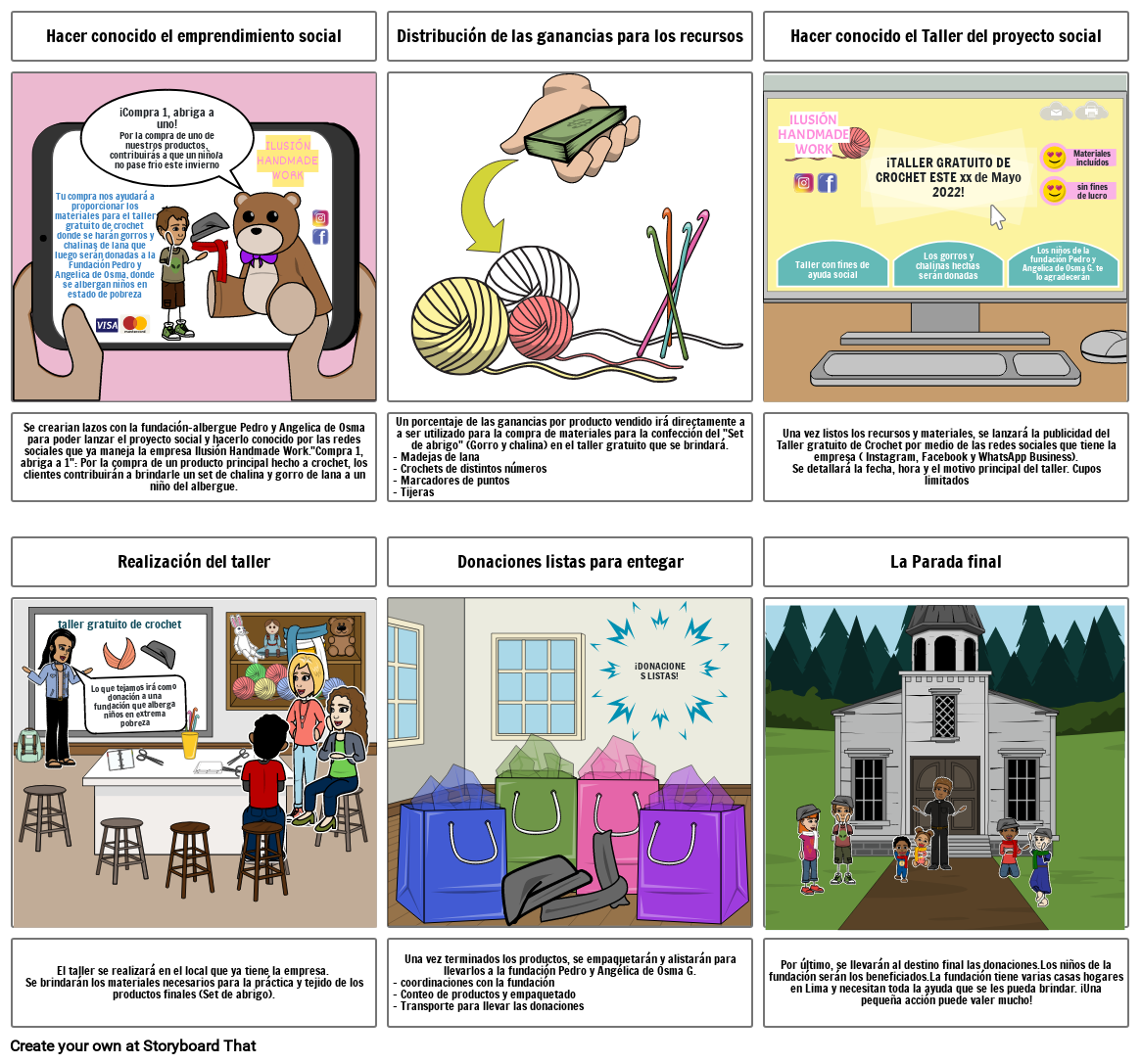 Se crearian lazos con la fundación-albergue Pedro y Angelica de Osma para poder lanzar el proyecto social y hacerlo conocido por las redes sociales que ya maneja la empresa Ilusión Handmade Work."Compra 1, abriga a 1": Por la compra de un producto principal hecho a crochet, los clientes contribuirán a brindarle un set de chalina y gorro de lana a un niño del albergue.