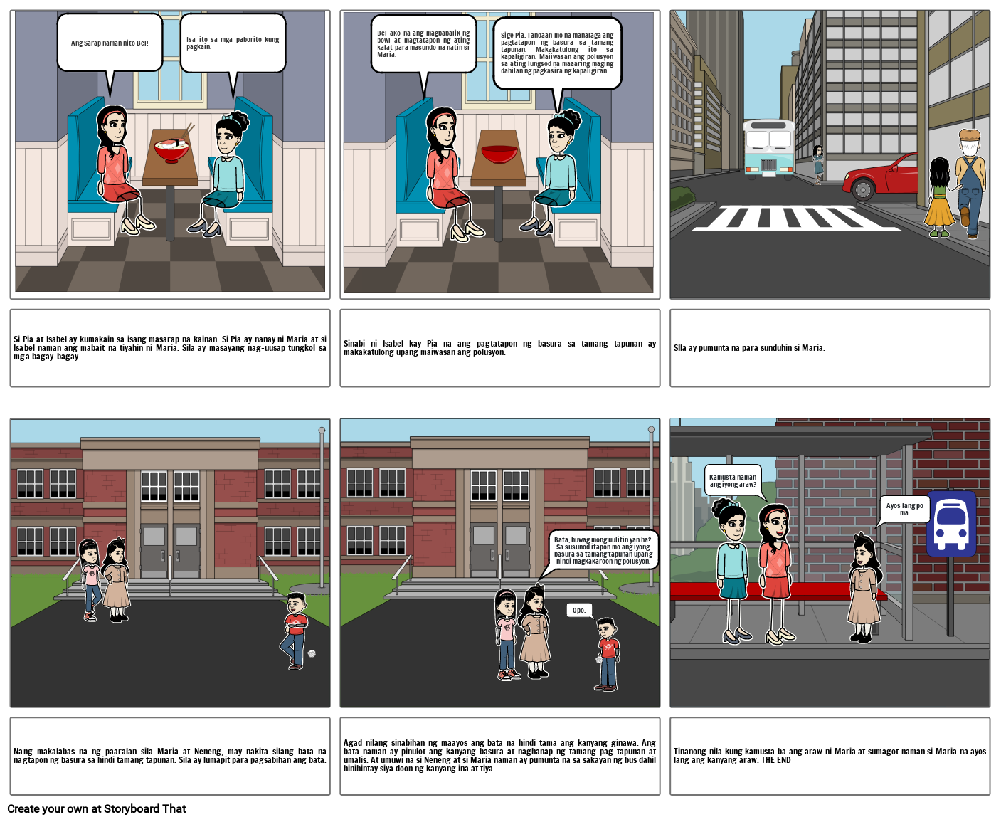Agad nilang sinabihan ng maayos ang bata na hindi tama ang kanyang ginawa. Ang bata naman ay pinulot ang kanyang basura at naghanap ng tamang pag-tapunan at umalis. At umuwi na si Neneng at si Maria naman ay pumunta na sa sakayan ng bus dahil hinihintay siya doon ng kanyang ina at tiya.