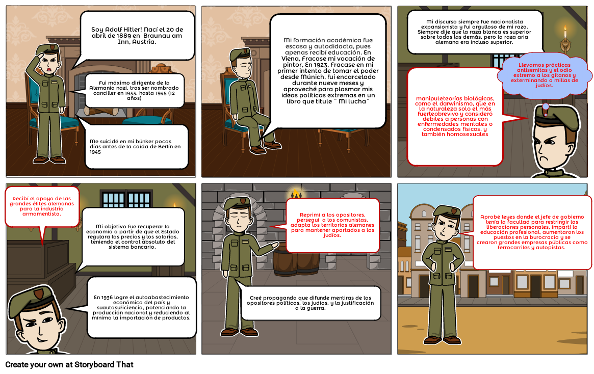 Mi formación académica fue escasa y autodidacta, pues apenas recibí educación. En Viena, Fracase mi vocación de pintor, En 1923, Fracase en mi primer intento de tomar el poder desde Múnich, fui encarcelado durante nueve meses y aproveché para plasmar mis ideas políticas extremas en un libro que titule ¨ Mi lucha¨
