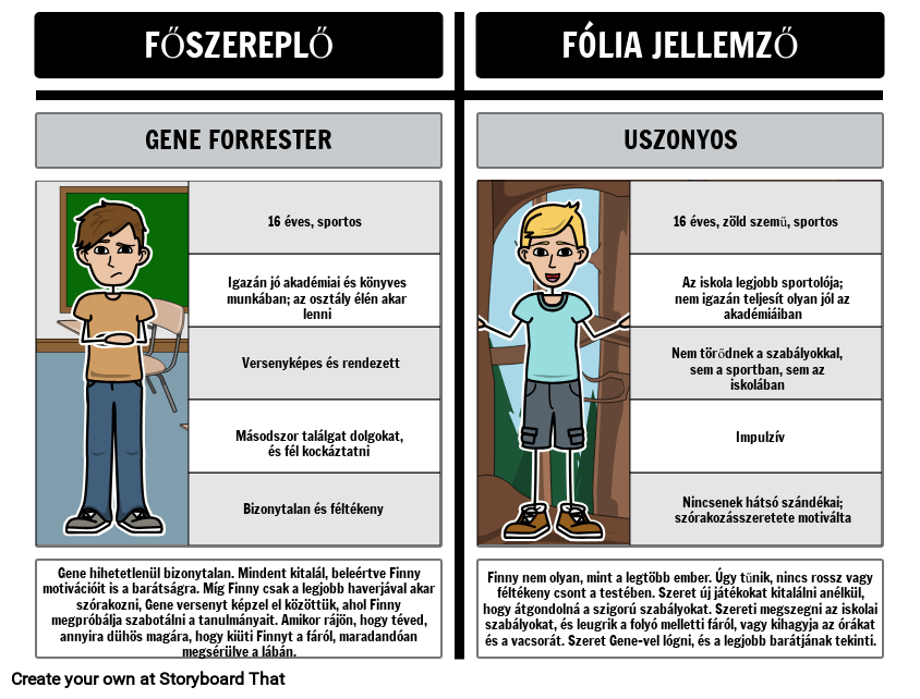 Gene hihetetlenül bizonytalan. Mindent kitalál, beleértve Finny motivációit is a barátságra. Míg Finny csak a legjobb haverjával akar szórakozni, Gene versenyt képzel el közöttük, ahol Finny megpróbálja szabotálni a tanulmányait. Amikor rájön, hogy téved, annyira dühös magára, hogy kiüti Finnyt a fáról, maradandóan megsérülve a lábán.