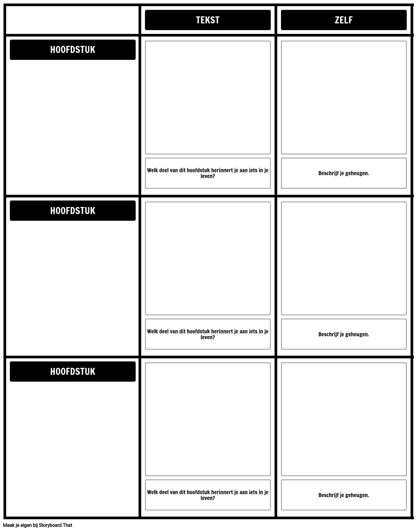 Tekst naar zelfverbindingssjabloon voor elk hoofdstuk. Laat de studenten een moment in de tekst identificeren waarmee ze persoonlijk verbinding kunnen maken