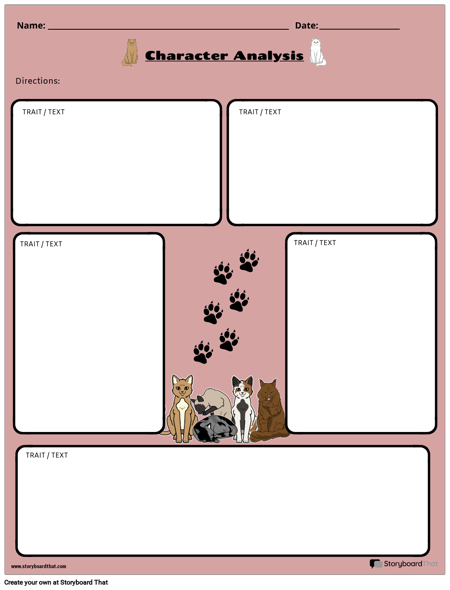 Digital karaktärsanalys arbetsblad med ett katttema.