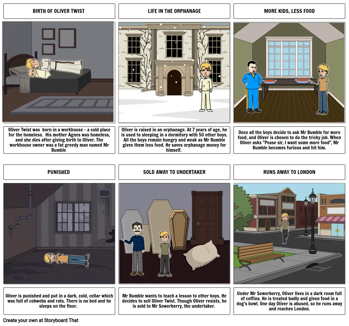 Oliver is raised in an orphanage. At 7 years of age, he is used to sleeping in a dormitory with 50 other boys. All the boys remain hungry and weak as Mr Bumble gives them less food. He saves orphanage money for himself.