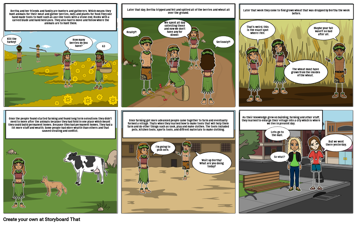 Bertha and her friends and family are hunters and gatherers. Which means they hunt animals for their meat and gather berries, nuts and plants for food.They use hand made tools to hunt such as axe like tools with a stone end, Rocks with a carved blade and hand held axes. They also had to move and follow where the animals are to hunt them.