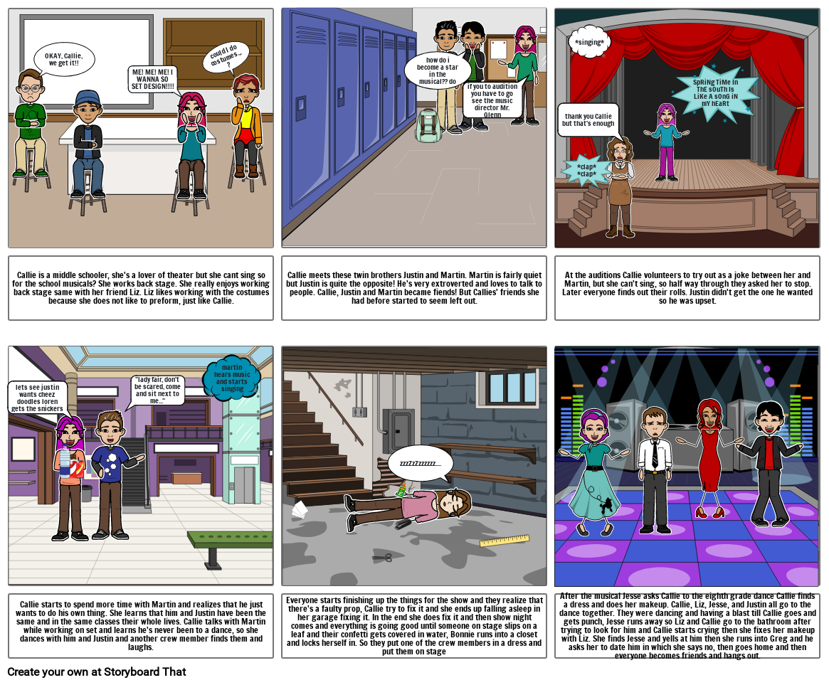 Callie is a middle schooler, she's a lover of theater but she cant sing so for the school musicals? She works back stage. She really enjoys working back stage same with her friend Liz. Liz likes working with the costumes because she does not like to preform, just like Callie.