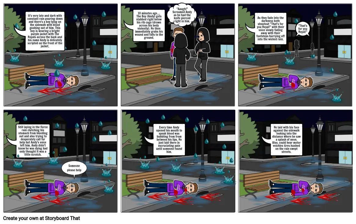 Still laying in the fierce rain clutching his stomach from bleeding out and also trying to desperately call for help but Andy's voice left him. Andy didn't know he was dying had only thought it was a little scratch.