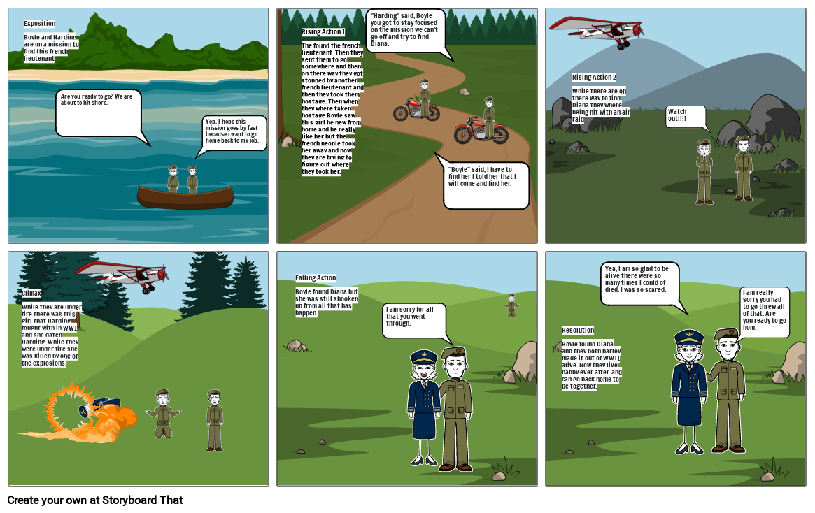 Rising Action 1The found the french lieutenant. Then they sent them to go somewhere and then on there way they got stopped by another french lieutenant and then they took them hostage. Then when they where taken hostage Boyle saw this girl he new from home and he really like her but the french people took her away and now they are trying to figure out where they took her.
