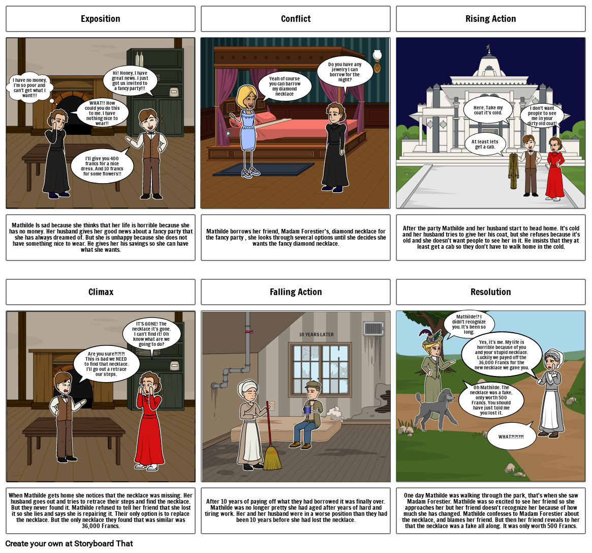 After 10 years of paying off what they had borrowed it was finally over. Mathilde was no longer pretty she had aged after years of hard and tiring work. Her and her husband were in a worse position than they had been 10 years before she had lost the necklace.