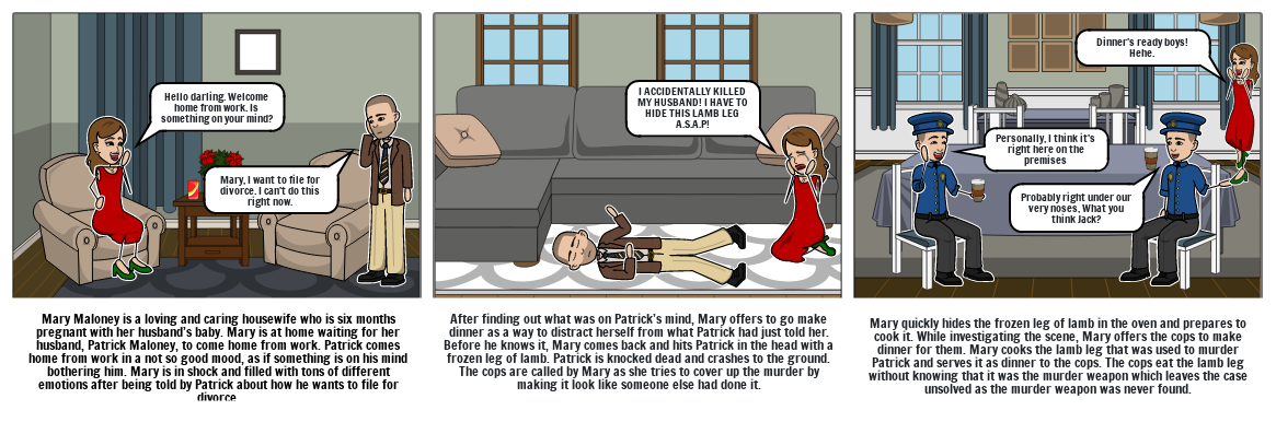 Mary quickly hides the frozen leg of lamb in the oven and prepares to cook it. While investigating the scene, Mary offers the cops to make dinner for them. Mary cooks the lamb leg that was used to murder Patrick and serves it as dinner to the cops. The cops eat the lamb leg without knowing that it was the murder weapon which leaves the case unsolved as the murder weapon was never found.