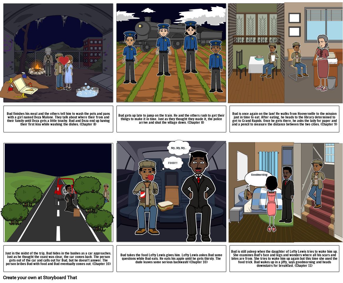 Bud takes the food Lefty Lewis gives him. Lefty Lewis askes Bud some questions while Bud eats. He eats his apple until he gets thirsty. The dude leaves some serious backwash! (Chapter 10)