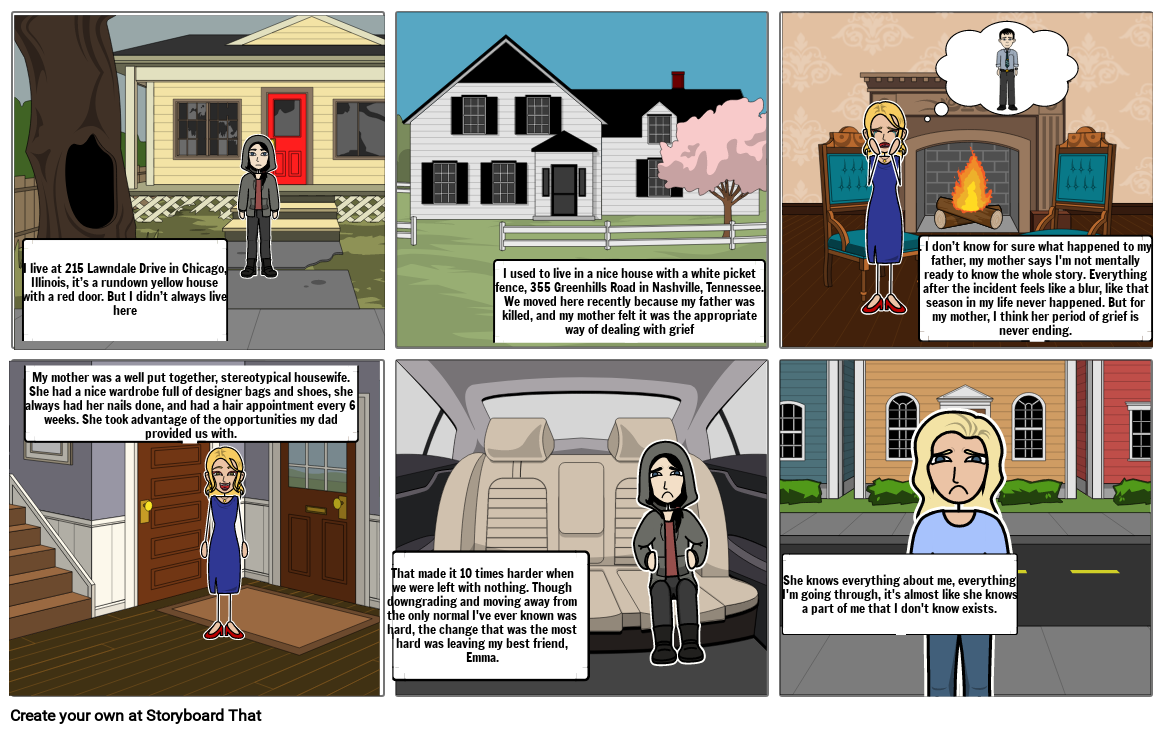I used to live in a nice house with a white picket fence, 355 Greenhills Road in Nashville, Tennessee. We moved here recently because my father was killed, and my mother felt it was the appropriate way of dealing with grief