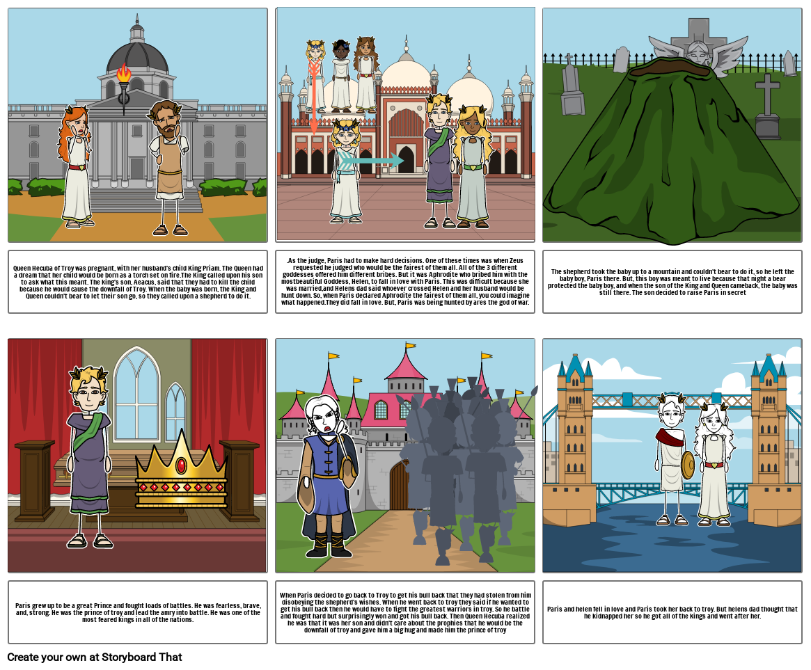 Queen Hecuba of Troy was pregnant, with her husband's child King Priam. The Queen had a dream that her child would be born as a torch set on fire.The King called upon his son to ask what this meant. The king's son, Aeacus, said that they had to kill the child because he would cause the downfall of Troy. When the baby was born, the King and Queen couldn't bear to let their son go, so they called upon a shepherd to do it.