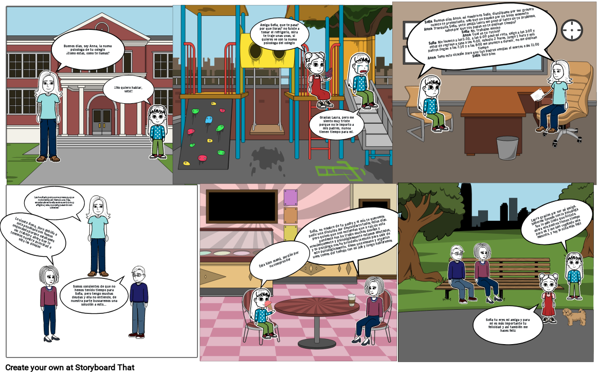 Sofia: Buenos días Anna, mi nombre es Sofia, discúlpame por ser grosera cuanto te presentaste, solo que no pasaba por un buen momentoAnna: Tranquila Sofia, ya tu amiga Laura me puso al tanto de tu problema, sabes por que tus papas no te dedican tiempo?Sofia: No, trabajan muchoAnna: Cual es tu rutina?Sofia: Me levanto a las 5:30, a las 6:00 pasa mi ruta, salgo a las 3:00 y estoy de regreso a casa a las 4:00, estudio 2 horas, juego 1 hora y mis padres llegan a las 7:30 y a las 8:00 me acuesto a dormir, no me dedican tiempoAnna: Toma esta citación para que tus padres vengan el martes a las 11:00Sofia: Esta bien