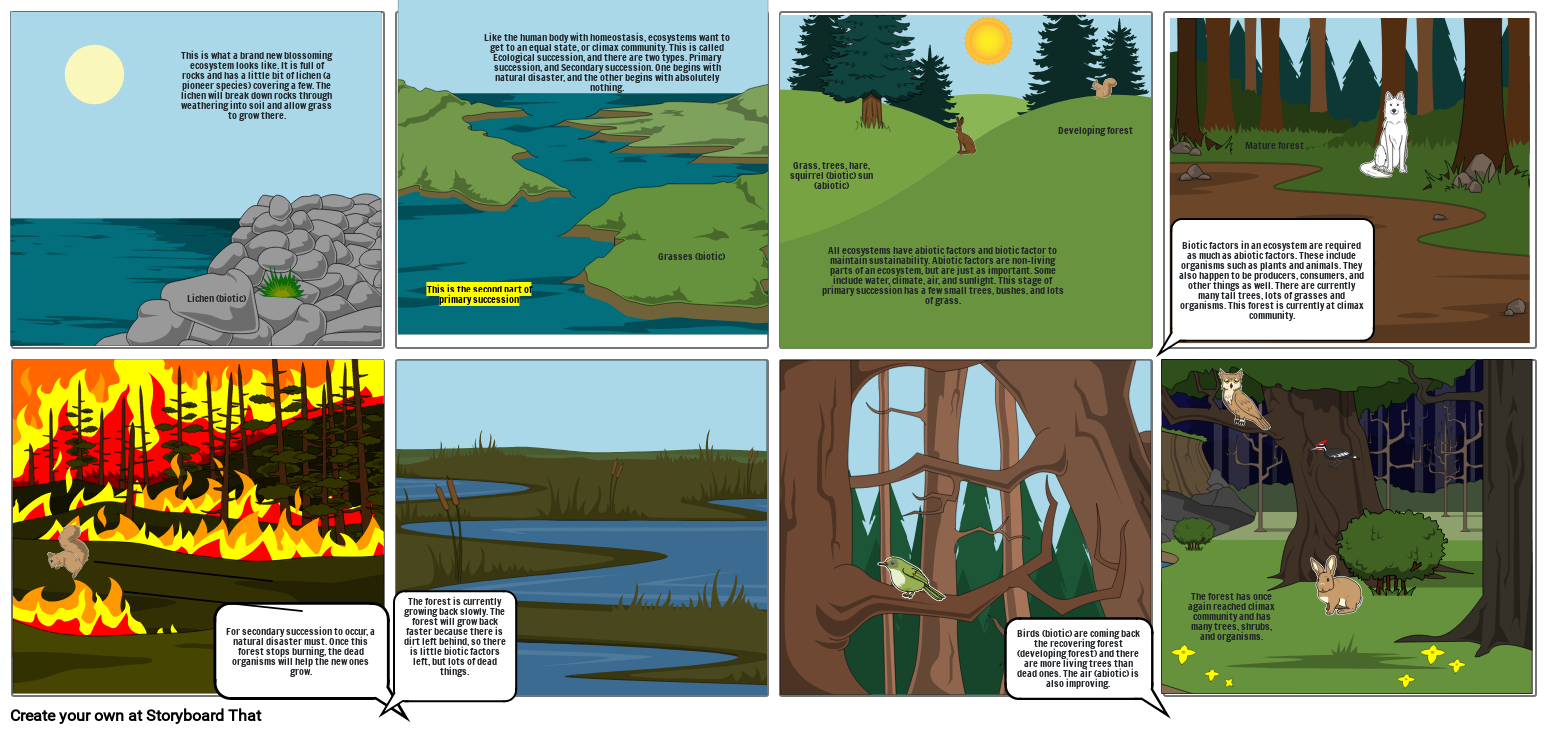 Like the human body with homeostasis, ecosystems want to get to an equal state, or climax community. This is called Ecological succession, and there are two types. Primary succession, and Secondary succession. One begins with natural disaster, and the other begins with absolutely nothing.