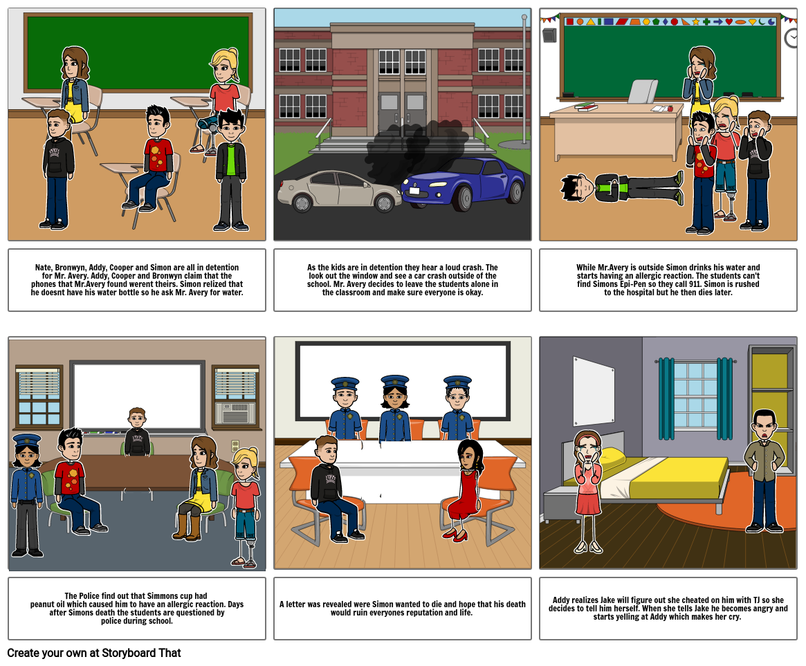 The Police find out that Simmons cup had peanut oil which caused him to have an allergic reaction. Daysafter Simons death the students are questioned bypolice during school.