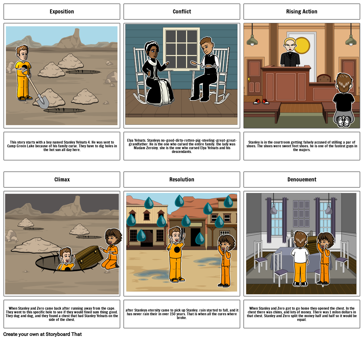 This story starts with a boy named Stanley Yelnats 4. He was sent to Camp Green Lake because of his family curse. They have to dig holes in the hot sun all day here.