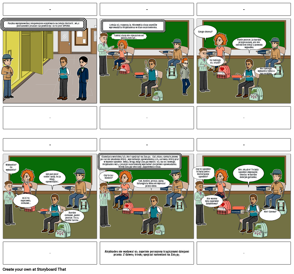 Ciamciara westchnął ciężko i spojrzał na Zasępę . Całą klasę czekało znowu po raz nie wiadomo który , wysłuchanie opowiadania o ciężarowcu, który prał w wannie spodnie. Swoją drogą mógł Zasępa wysilić się na coś nowego. Alcybiades wciąż jeszcze oszołomiony wysłuchał cierpliwie opowiadania. Kiedy Zasępa skończył, zapanowała cisza.
