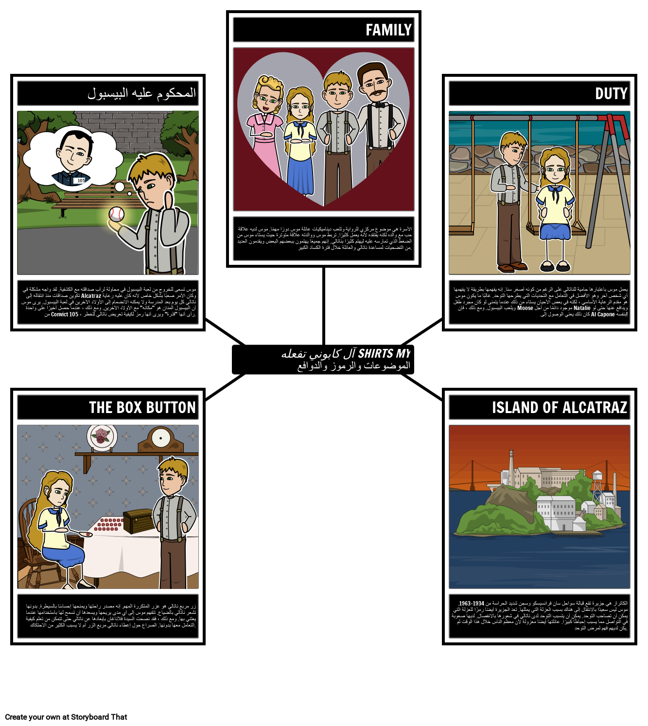 يمكن للطلاب تتبع السمات والرموز والزخارف المختلفة الموجودة في Al Capone Does My Shirts وإنشاء خريطة عنكبوتية لتوضيح الأمثلة