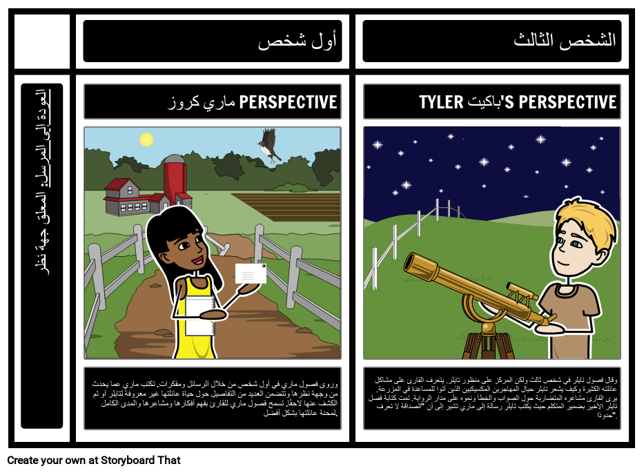 إن تحليل اختيار المؤلف للراوي ووجهة نظرهم ووجهة نظرهم يمنح القارئ فهمًا أعمق للقصة والشخصيات وتحيزاتهم ودوافعهم. اختارت مؤلفة كتاب العودة إلى المرسل ، جوليا ألفاريز ، استخدام راويين يعطيان أصواتًا لكل من العائلة الأمريكية والعائلة المكسيكية في القصة. يمكن للطلاب إنشاء لوحة عمل تحدد الراويين في القصة ووجهة نظرهم ووجهات نظرهم.