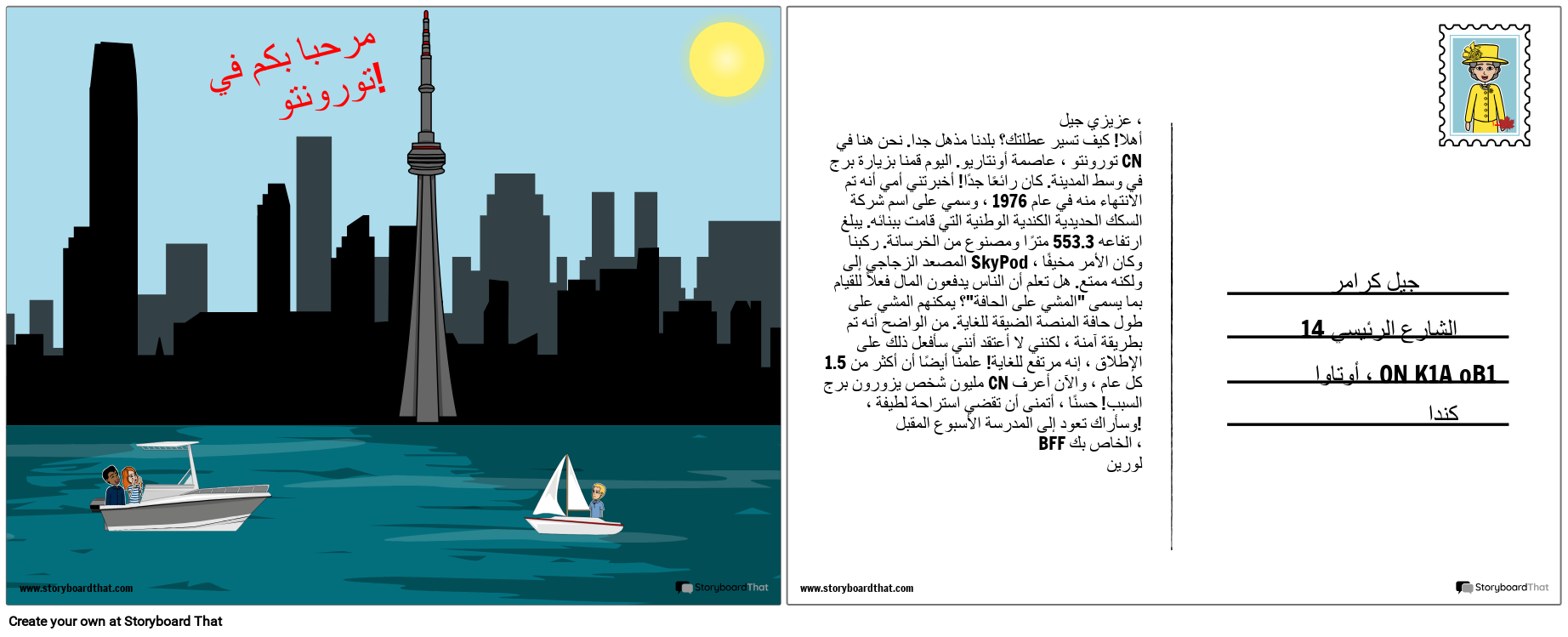عزيزي جيل ، أهلا! كيف تسير عطلتك؟ بلدنا مذهل جدا. نحن هنا في تورونتو ، عاصمة أونتاريو. اليوم قمنا بزيارة برج CN في وسط المدينة. كان رائعًا جدًا! أخبرتني أمي أنه تم الانتهاء منه في عام 1976 ، وسمي على اسم شركة السكك الحديدية الكندية الوطنية التي قامت ببنائه. يبلغ ارتفاعه 553.3 مترًا ومصنوع من الخرسانة. ركبنا المصعد الزجاجي إلى SkyPod ، وكان الأمر مخيفًا ولكنه ممتع. هل تعلم أن الناس يدفعون المال فعلاً للقيام بما يسمى "المشي على الحافة"؟ يمكنهم المشي على طول حافة المنصة الضيقة للغاية. من الواضح أنه تم بطريقة آمنة ، لكنني لا أعتقد أنني سأفعل ذلك على الإطلاق ، إنه مرتفع للغاية! علمنا أيضًا أن أكثر من 1.5 مليون شخص يزورون برج CN كل عام ، والآن أعرف السبب! حسنًا ، أتمنى أن تقضي استراحة لطيفة ، وسأراك تعود إلى المدرسة الأسبوع المقبل! BFF الخاص بك ، لورين