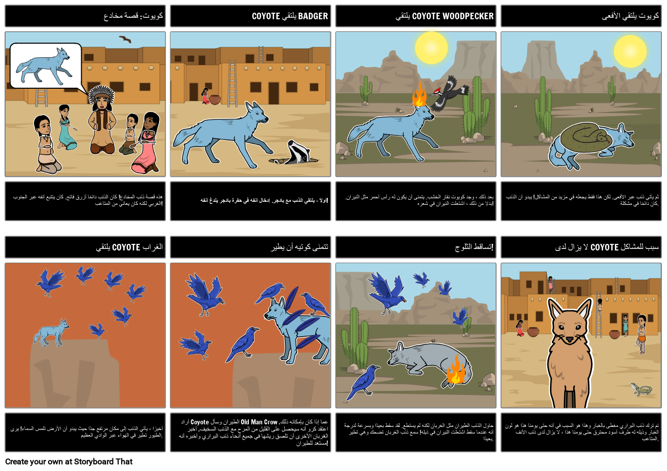 أراد Coyote الطيران وسأل Old Man Crow عما إذا كان بإمكانه ذلك. اعتقد كرو أنه سيحصل على القليل من المرح مع الذئب السخيف. أخبر الغربان الأخرى أن تلصق ريشها في جميع أنحاء ذئب البراري وأخبره أنه مستعد للطيران!