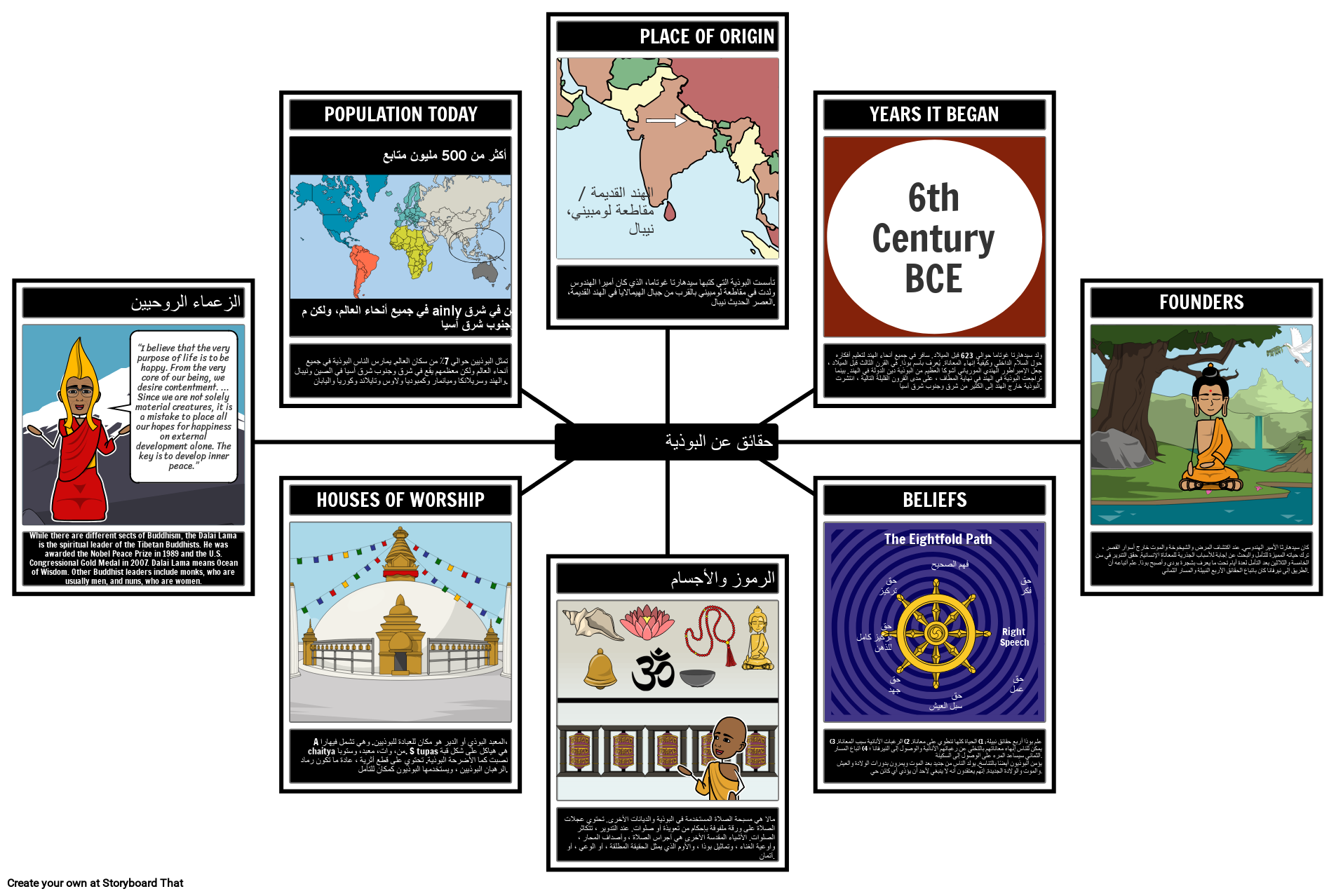 اطلب من الطلاب أن يصفوا ويوضحوا حقائق مختلفة عن البوذية. يمكنهم الإجابة على الأسئلة التالية: من أين نشأ الدين ؟: من مؤسسيه ؟: متى بدأ؟ ما هي بعض المعتقدات الأساسية؟ ما هي بعض الأمثلة على الأشياء أو الرموز المقدسة ؟: كيف يعبد أتباعها / دور العبادة؟ من هم قادتها الروحيون ؟، إلخ.
