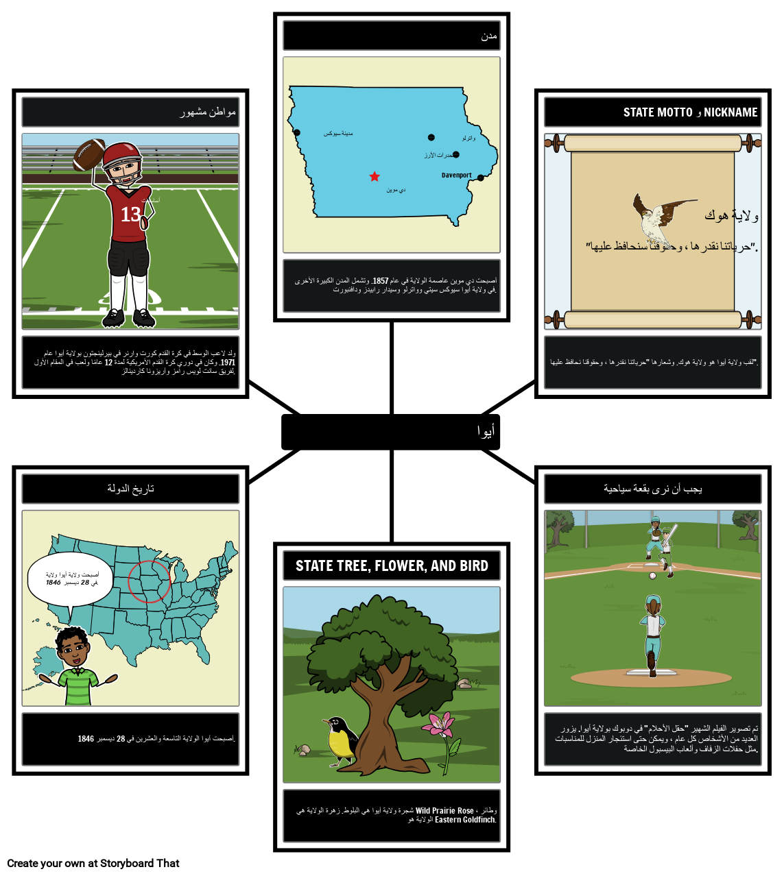 قم بإنشاء خريطة عنكبوتية توضح حقائق عن ولاية آيوا ، مثل الشعار والمعالم والعواصم والمزيد!