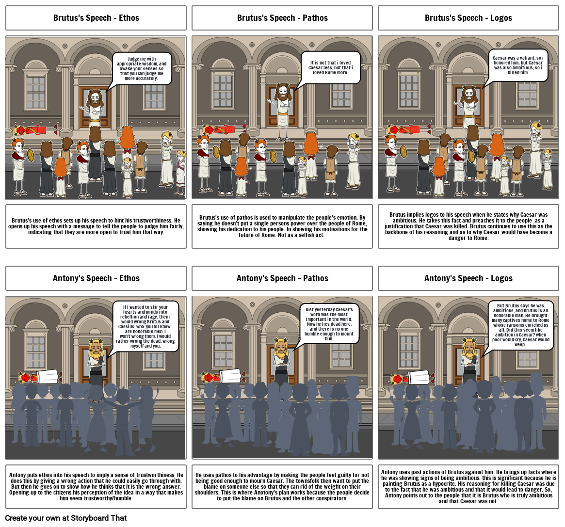 Antony puts ethos into his speech to imply a sense of trustworthiness. He does this by giving a wrong action that he could easily go through with. But then he goes on to show how he thinks that it is the wrong answer. Opening up to the citizens his perception of the idea in a way that makes him seem trustworthy/humble.