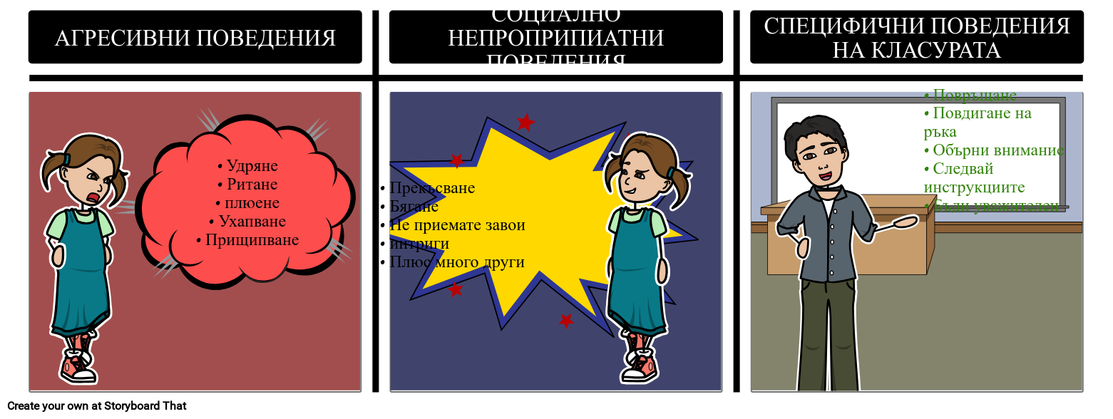• Повръщане • Повдигане на ръка • Обърни внимание • Следвай инструкциите • Бъди уважителен