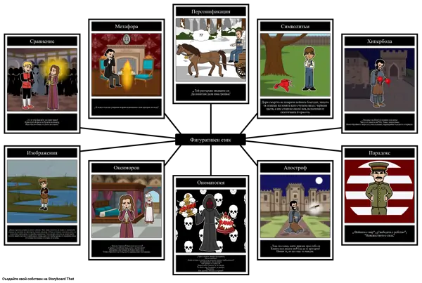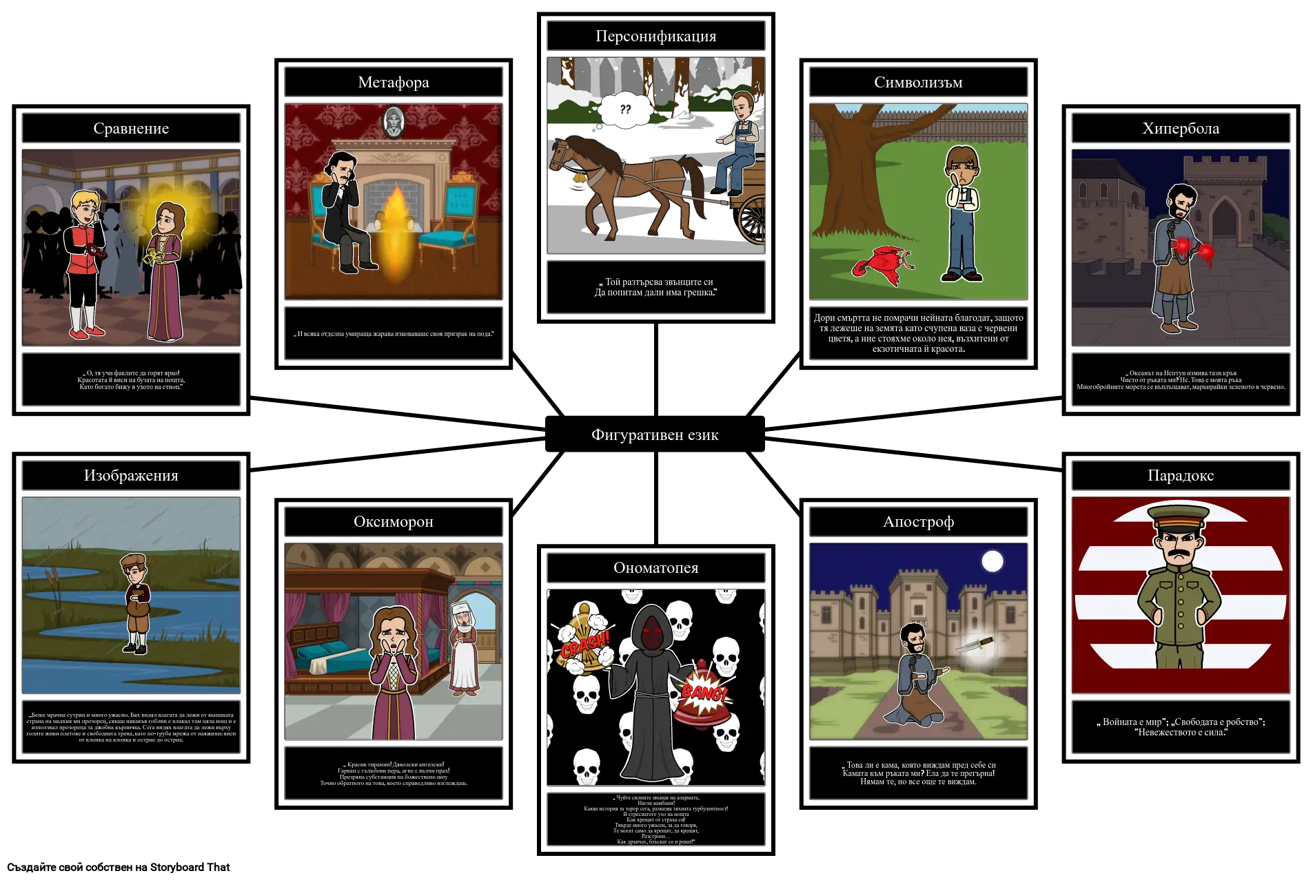 Примери за фигуративен език в литературата, от персонификация до ономатопея.